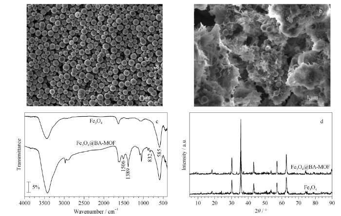 a. scanning electron micrograph of Fe3O4; b. scanning electron micrograph of Fe3O4@BA-MOF; c. FTIR spectrum; d. X-ray diffraction pattern.