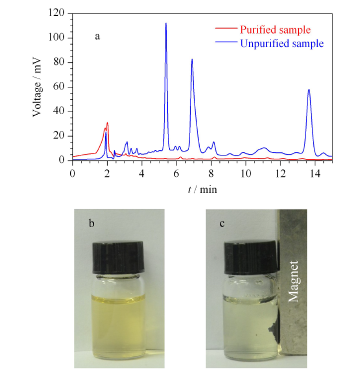 茶叶提取液经由Fe3O4@BA-MOF处理前后的 (a)高效液相色谱图及(b,c)磁分离照片